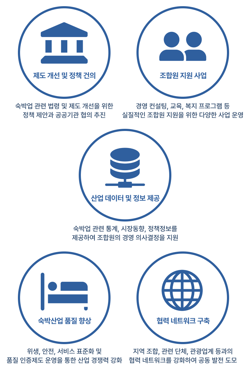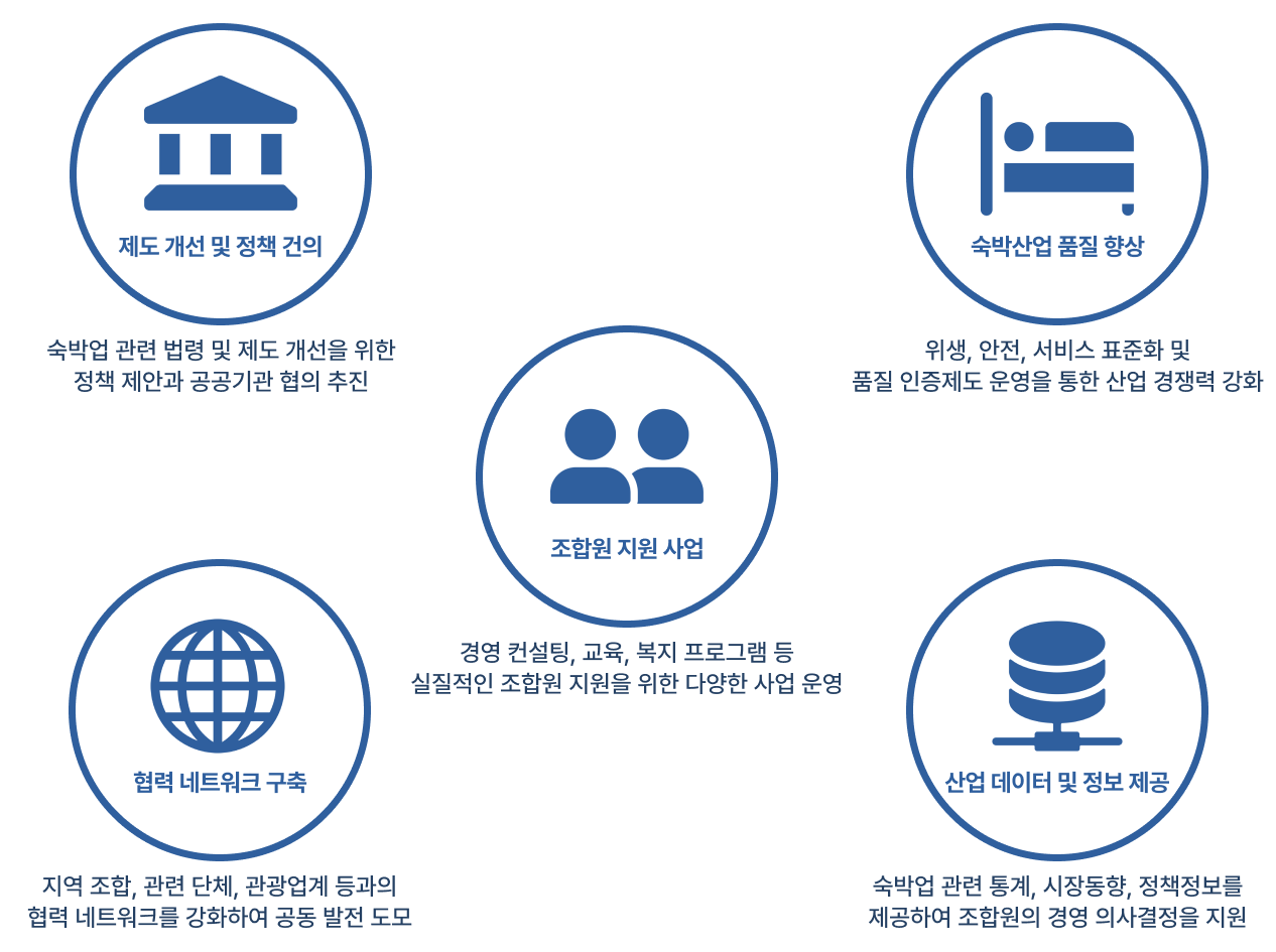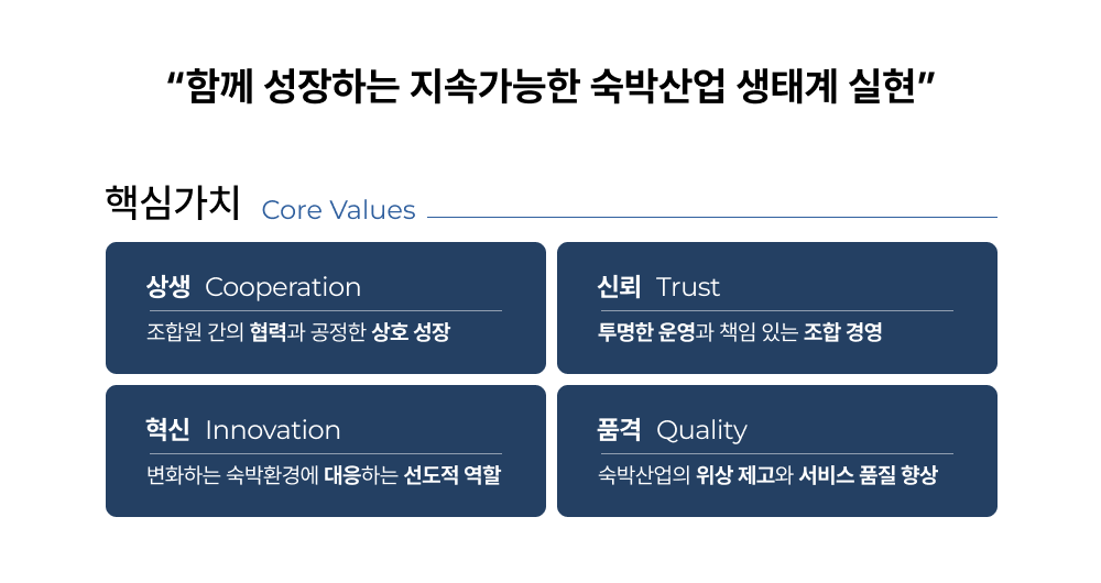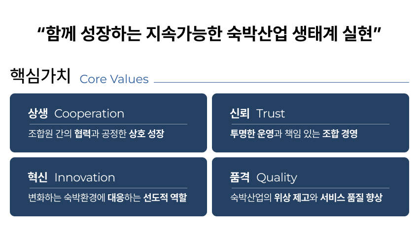 조합은 숙박업의 품격을 높이고,조합원이 주체가 되어 참여하는 투명하고 공정한 조직 문화를 기반으로국가 관광산업 발전에 기여하겠습니다.